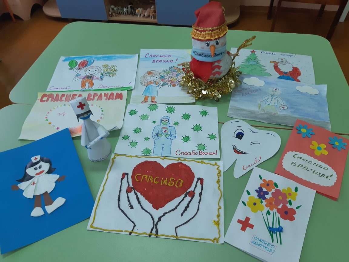 Так, в детском саду № 83 г. Чебоксары дети совместно с родителями сделали поделки и рисунки на медицинскую тематику. Работы получились разнообразные: как плоскостные, так и объемные с надписью «Спасибо, Врачам!», «Спасибо, Доктор!», #CпасибоВрачам, #СпасибоДоктор.